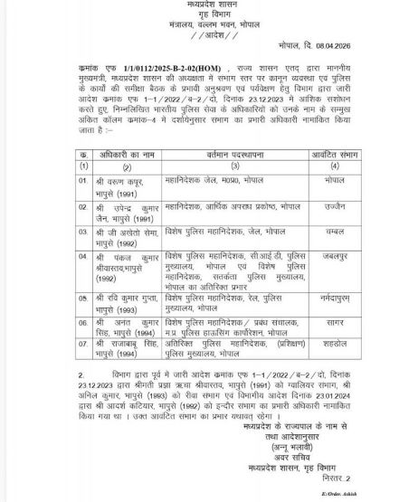 मध्यप्रदेश में प्रशासनिक फेरबदल, IPS अधिकारियों को सौंपे गए संभाग